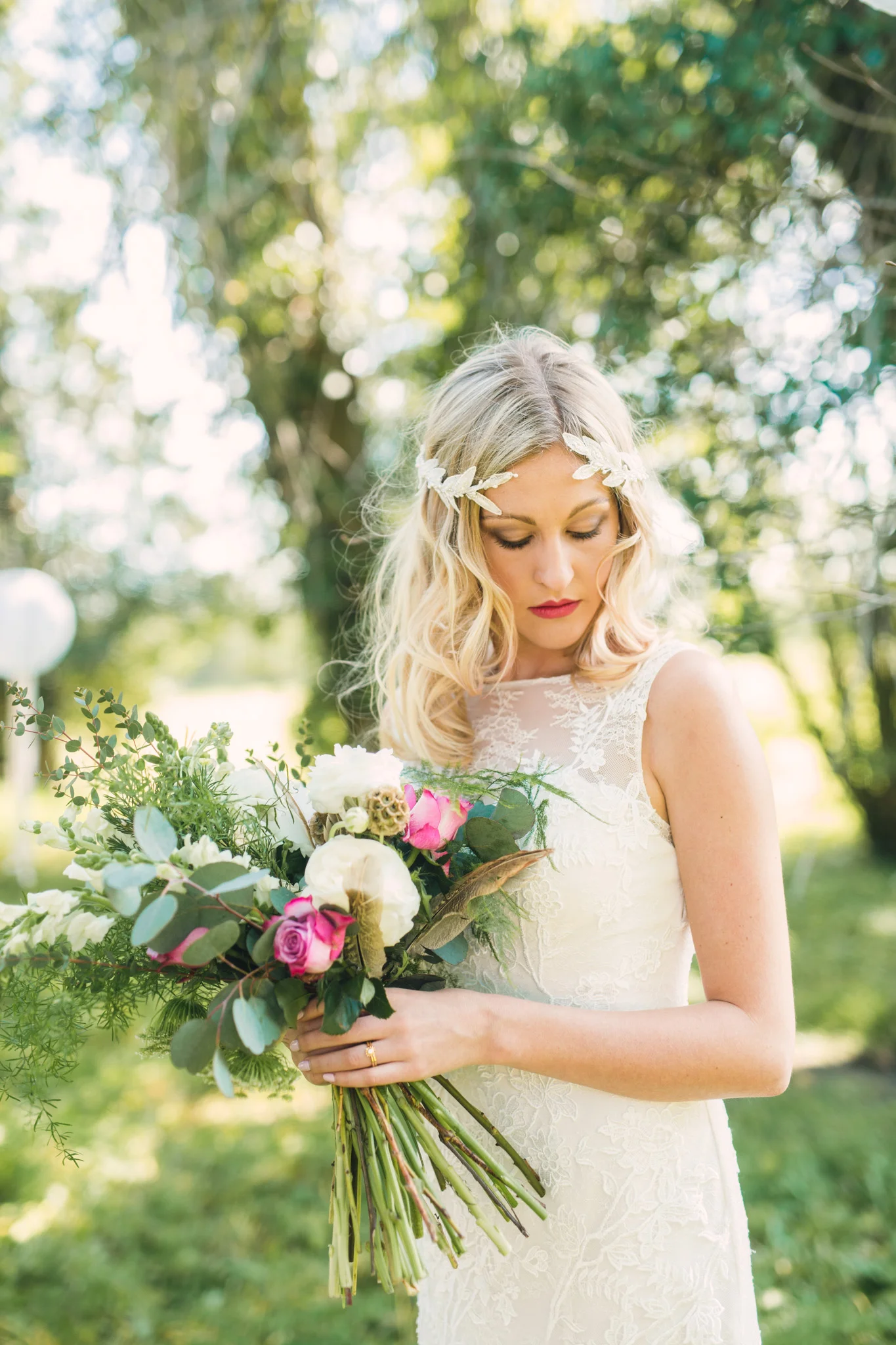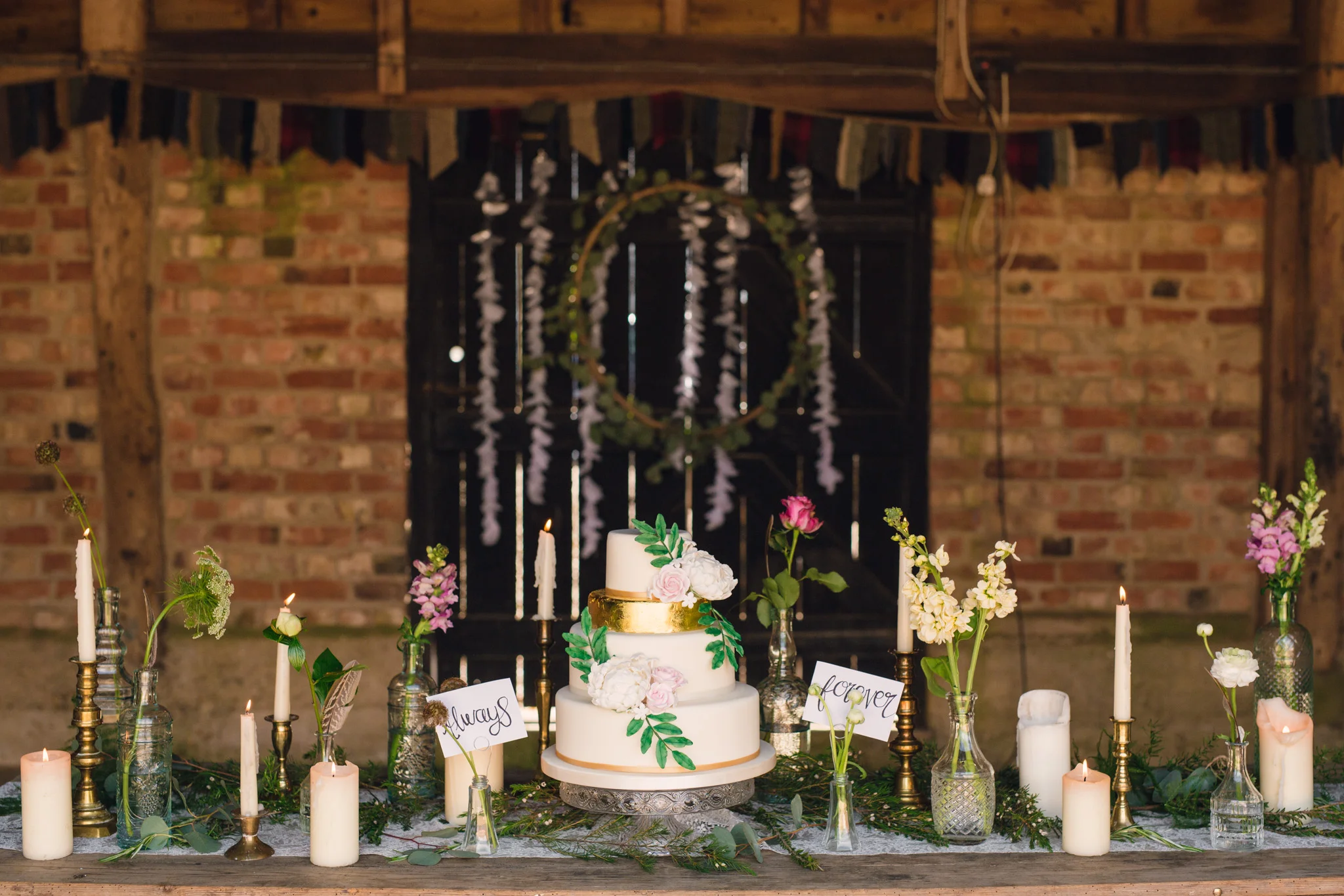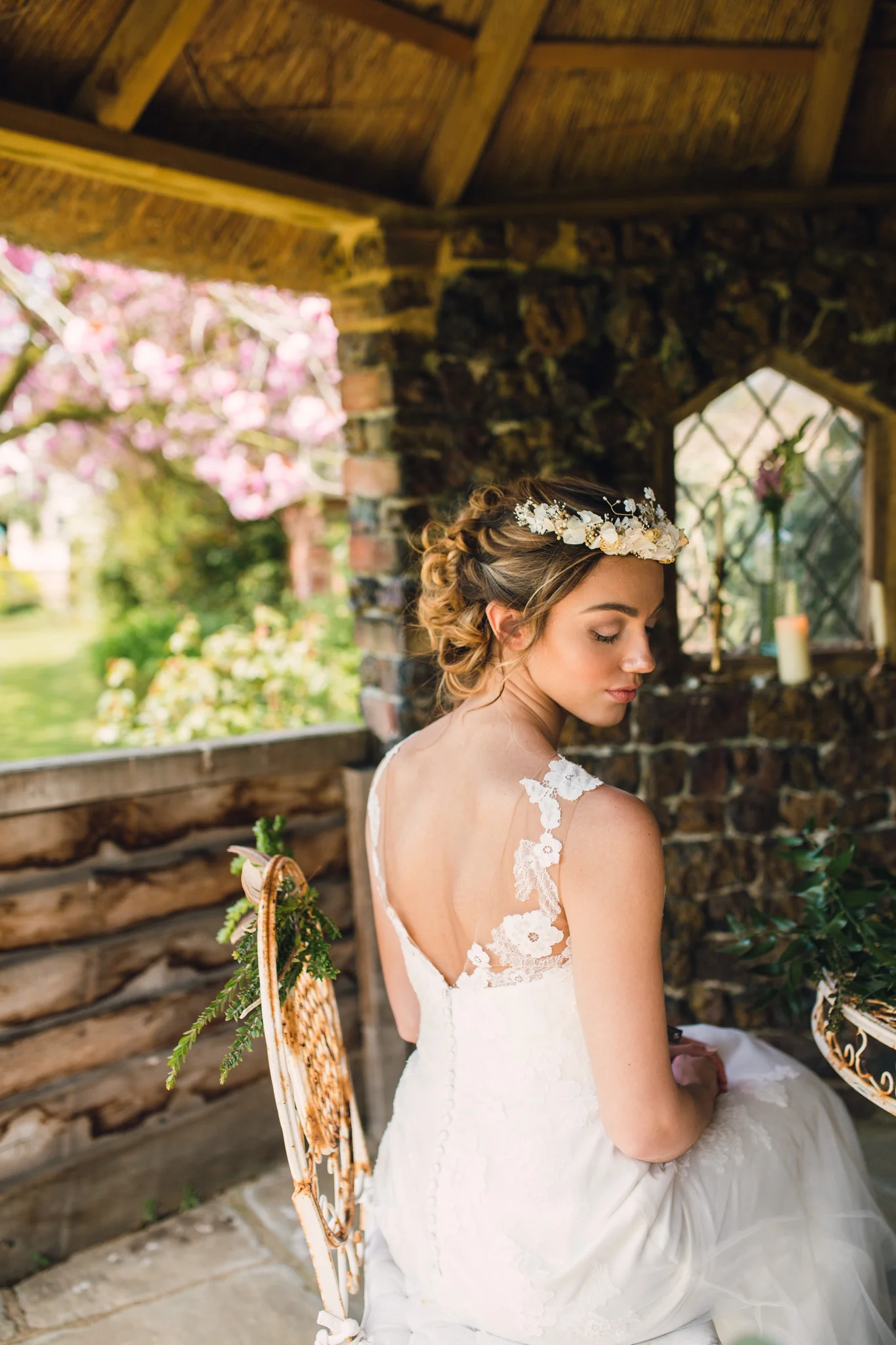 On the day, wedding stylist Gemma at The White Emporium set up 5 beautiful scenes for us to shoot against, with a variety of wonderful rustic props and stunning, relaxed floral arrangements filled with whites, pinks and lots of greenery from Sarah at The Flower Hut. Our cake was provided by Helen at Sweetness and Delight, with beautifully detailed handmade icing flowers and a gold leaf tier. It was so exciting watching the shoot unfold as all the vendors arrived and set up. Our collective vision for the shoot was coming together and everything was beautifully cohesive in style.