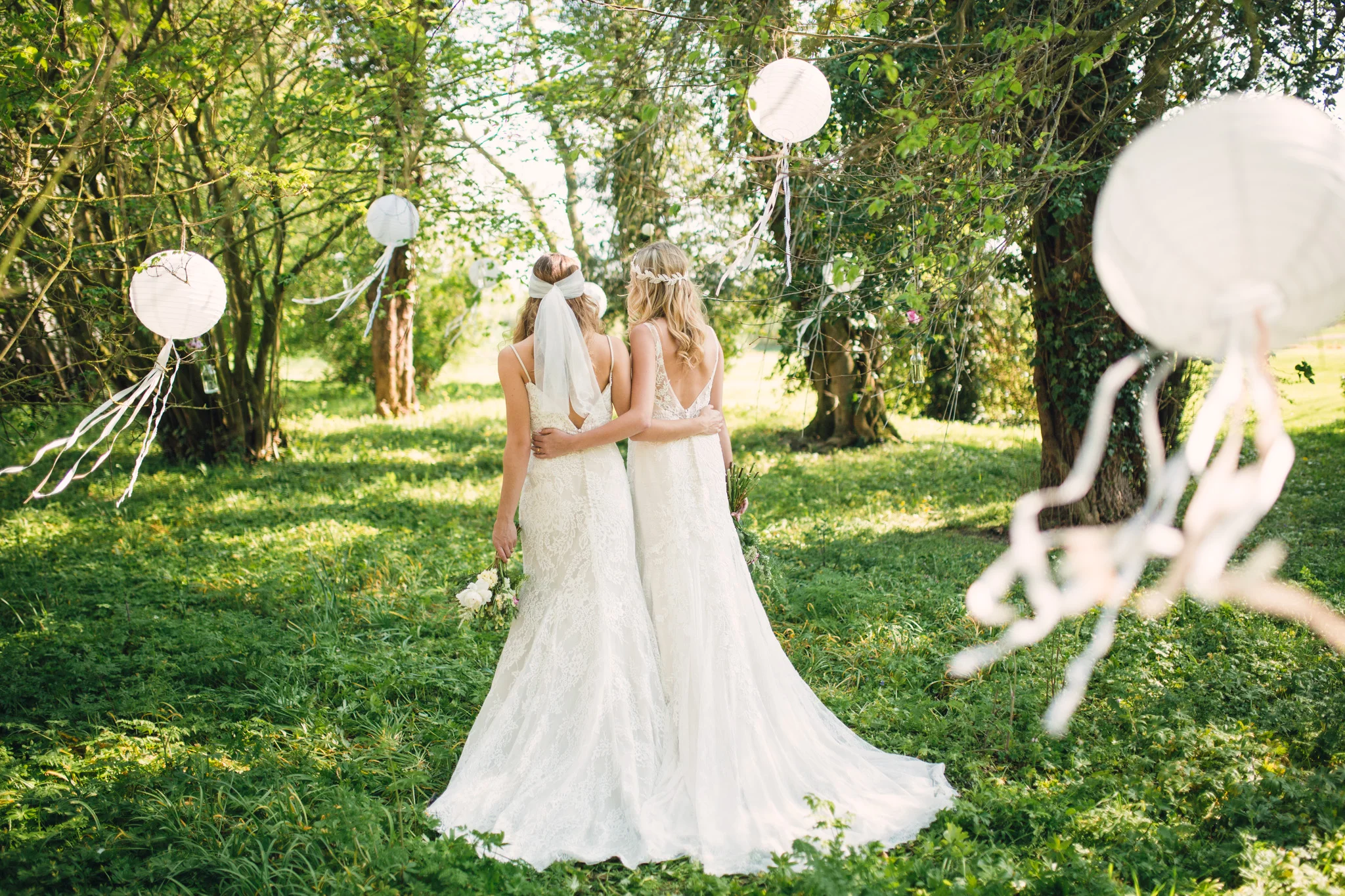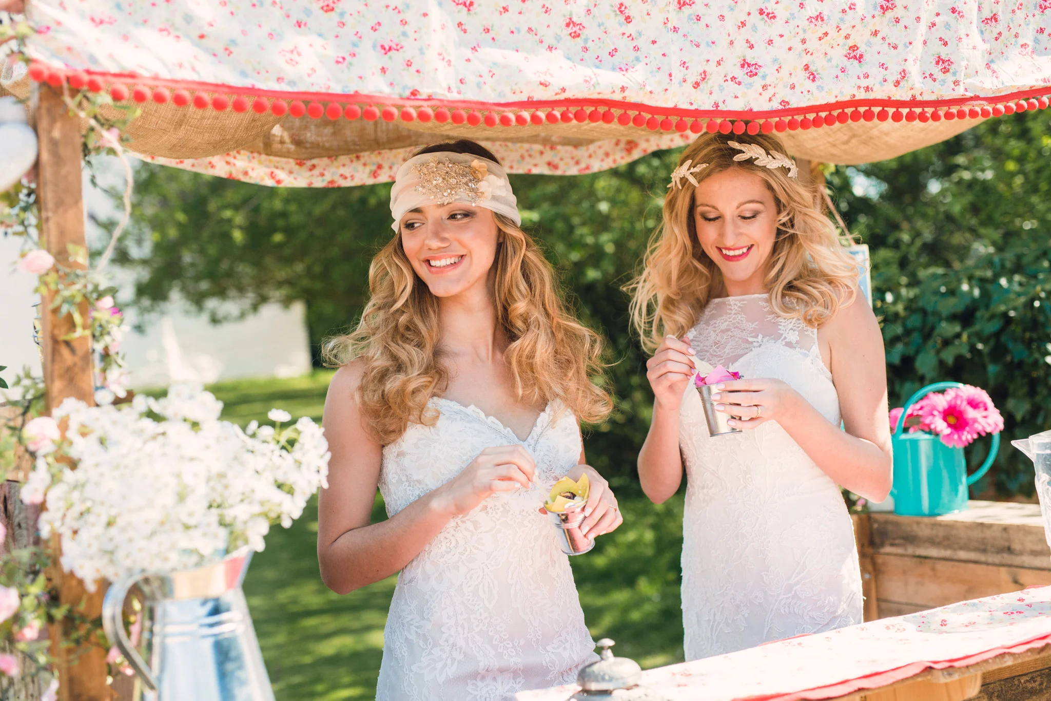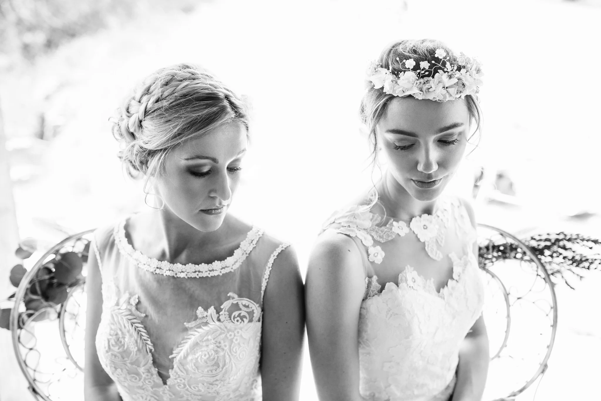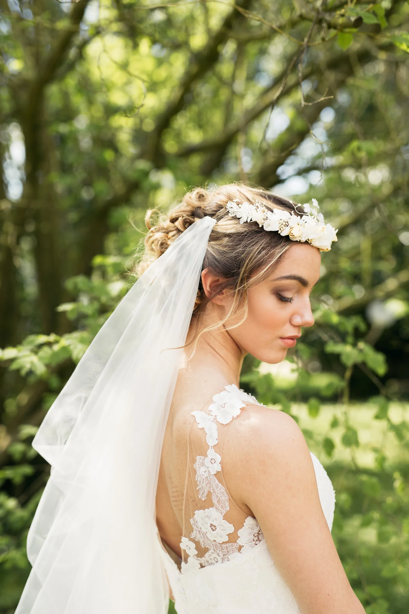 Our beautiful models Georgia and Francesca were long time clients of our hair stylist Kate, and they were styled in dresses from George James Bridal, handmade headpieces by Love From Becky and ethical Fairtrade gold bridal jewellery by Arabel Lebrusan.