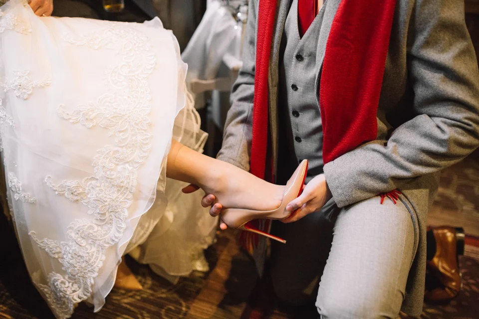 They embraced the Christmas timing of their wedding day with touches of red and icy sparkles in their decorations. Elizabeth wore a gorgeous lace dress paired with Louboutin heels and even brought her heeled Timberlands along for photos outdoors after the ceremony - love it!