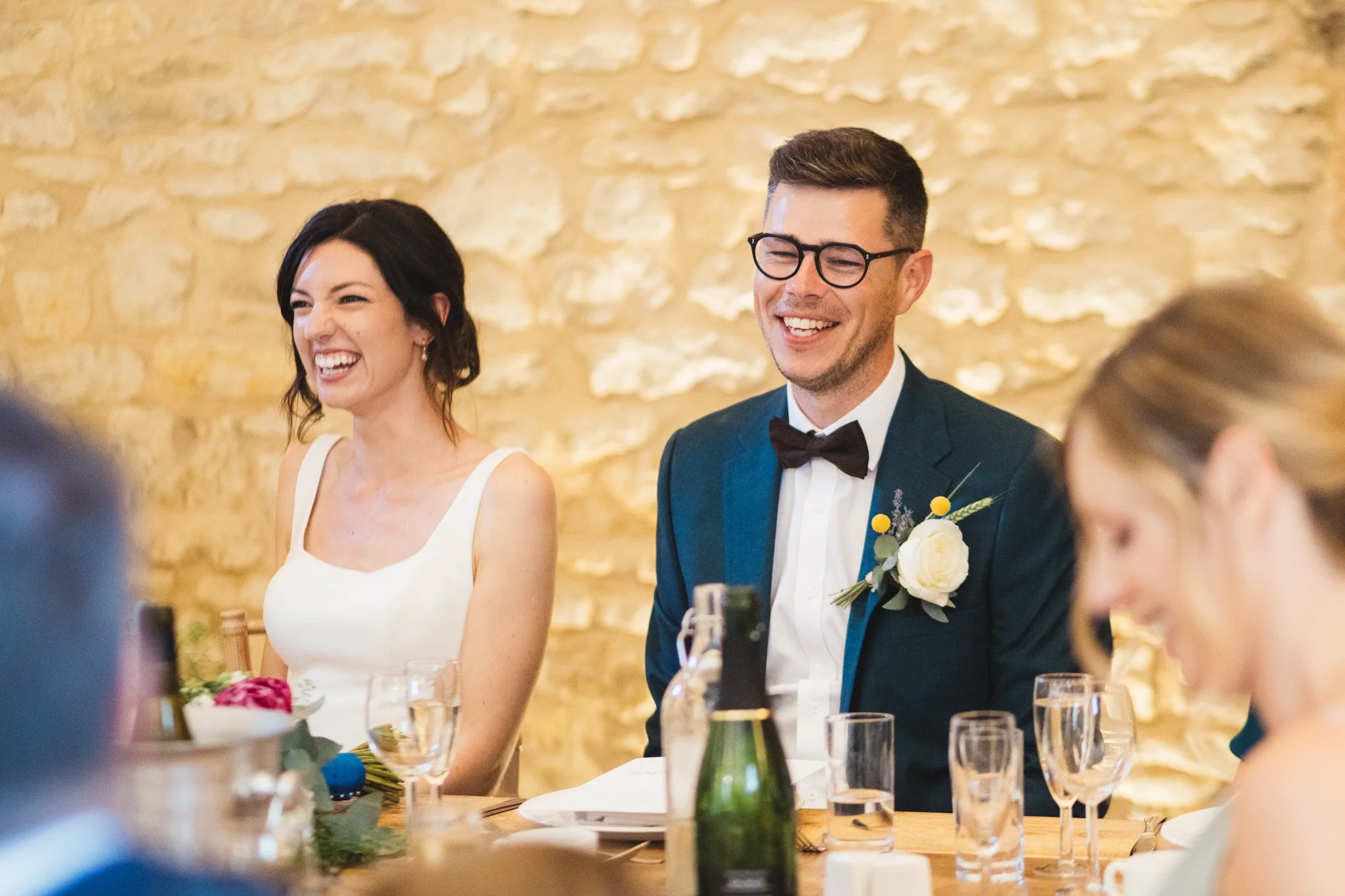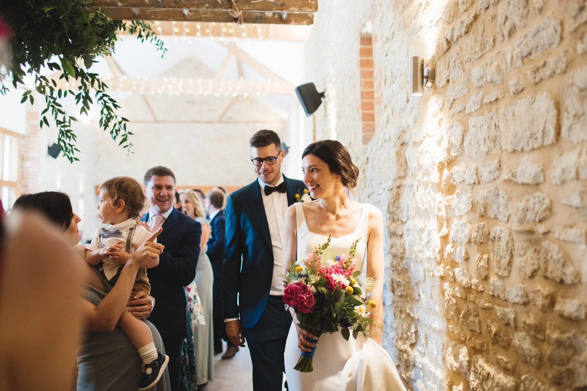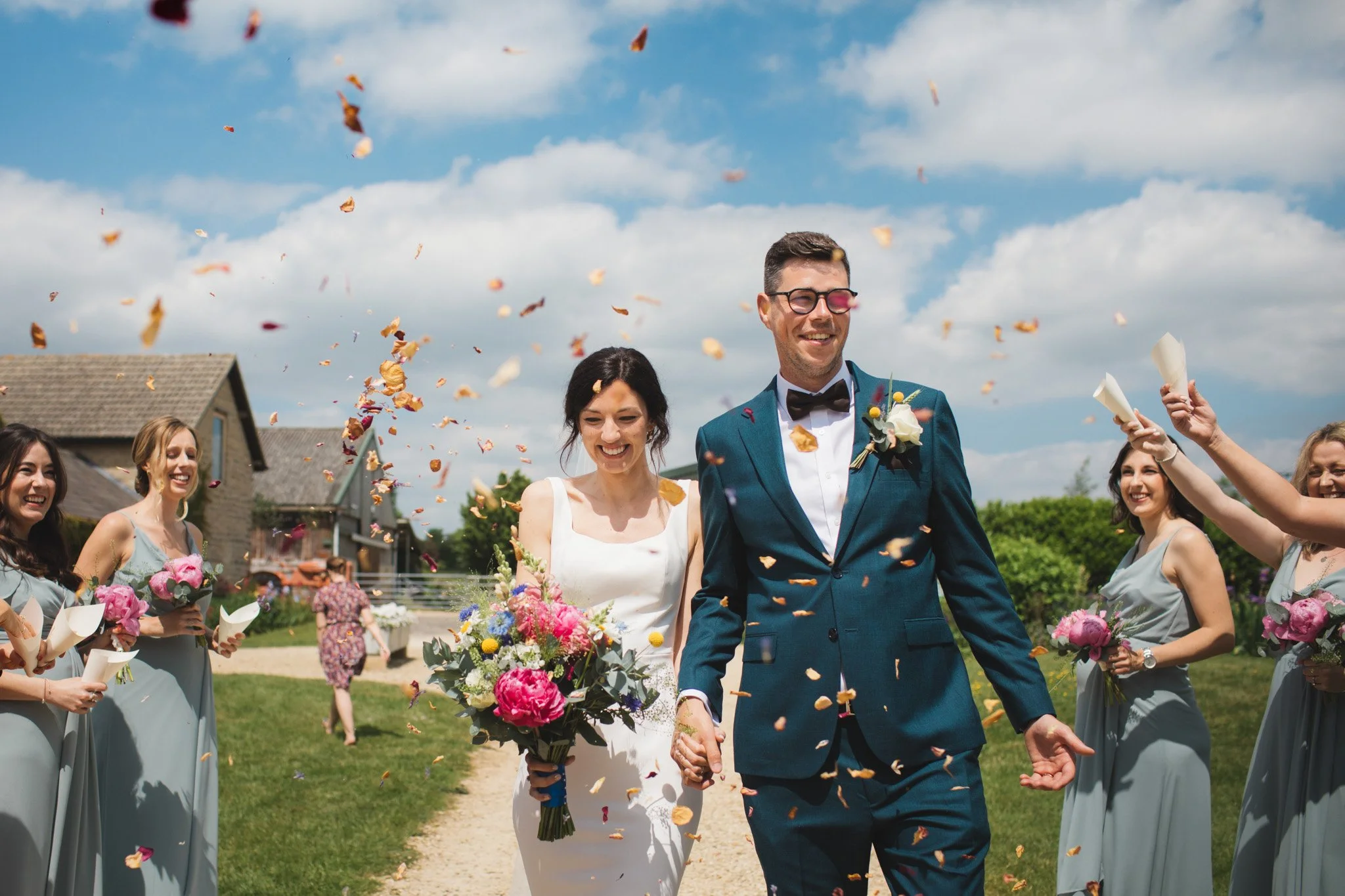 After a shower of petal confetti, everyone enjoyed drinks in the sunshine whilst the barn was set up for dinner: long tables, big urns of wildflowers and that rustic vibe that Huntsmill always excels at.