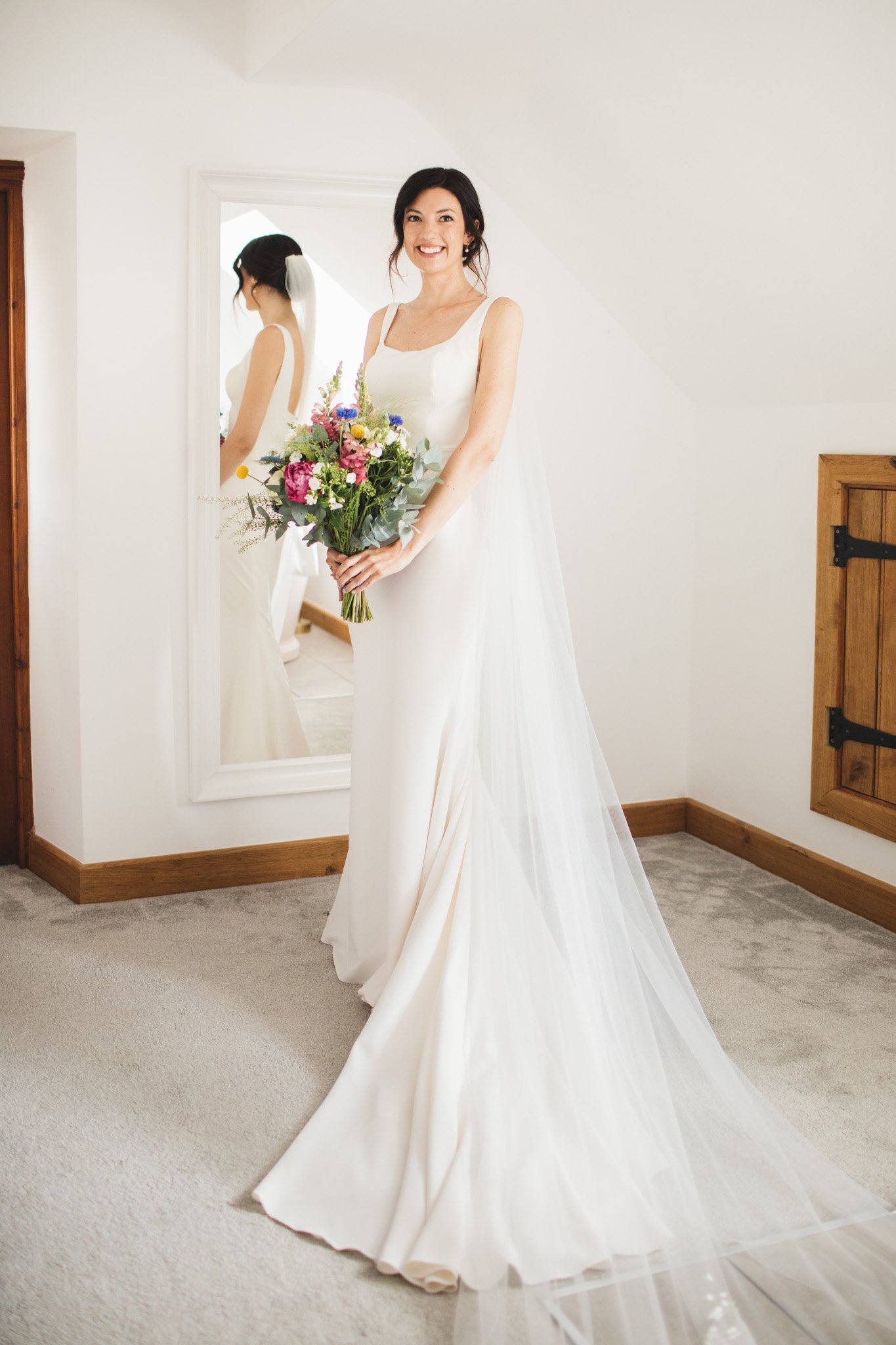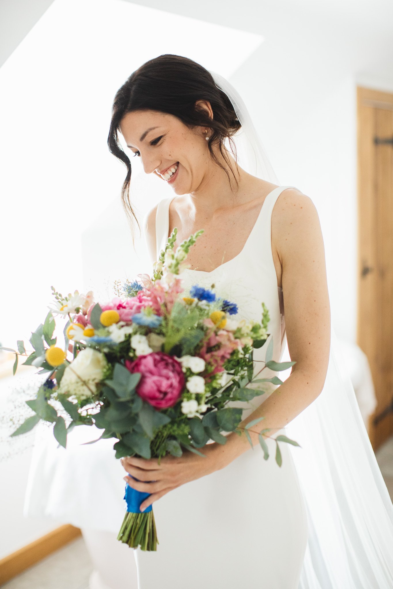 Due to coronavirus restrictions, they kept it to just 30 guests and it was such a joy to document their intimate day. It started with a buzz of excitement as the girls got ready at Blacksmiths Cottage, before heading over to the Old Dairy to get changed into their outfits. Felicity wore a Cizzy Bridal dress with a matching veil, featuring delicate embroidered polkadots scattered along the end of the veil. Her bouquet was perfect for a June wedding, filled with vibrant wildflowers and beautiful pink peonies (my favourite!)