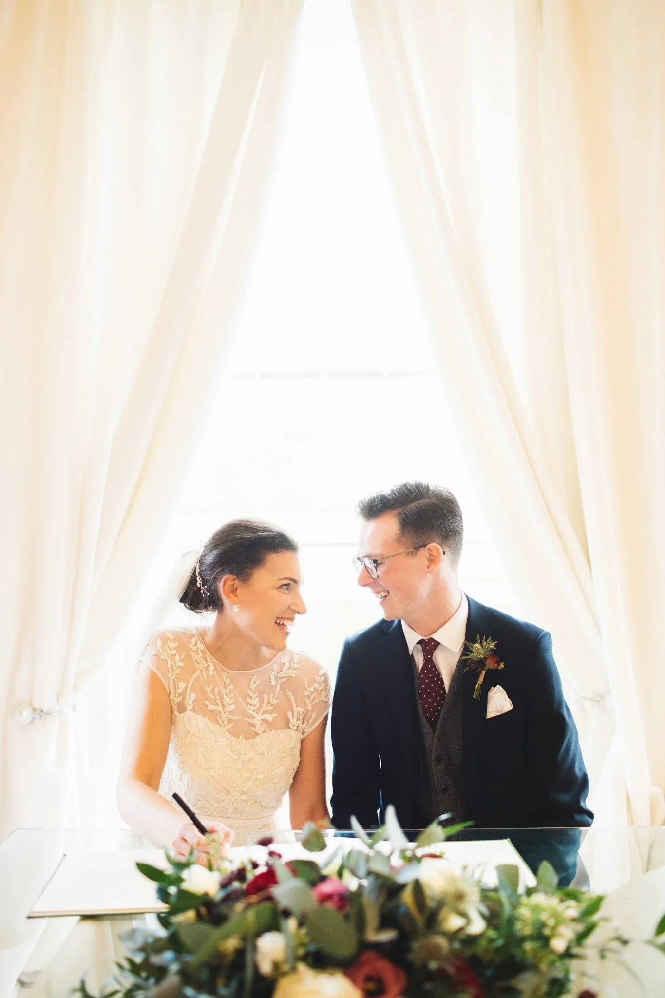 Their ceremony took place in a room overlooking the gardens, and it was filled with heartfelt moments and laughter. They celebrated with petal confetti outside before heading back indoors for a cosy drinks reception.
