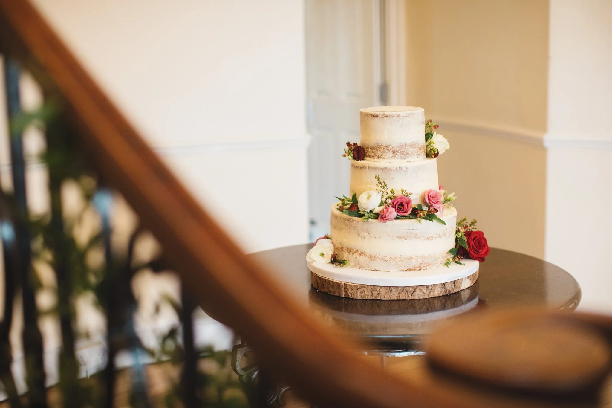 A winter three tier, semi naked,  wedding cake with white pink and red roses.