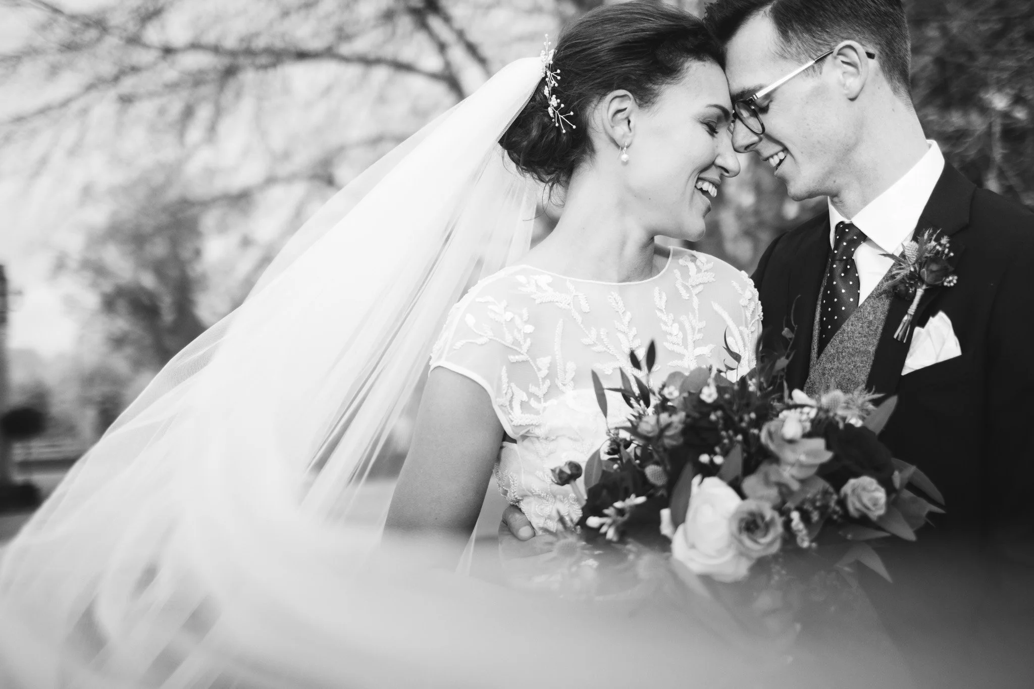 Brides veil sweeps agross her and the groom during an intimate moment in the gardens of Eastington Park.