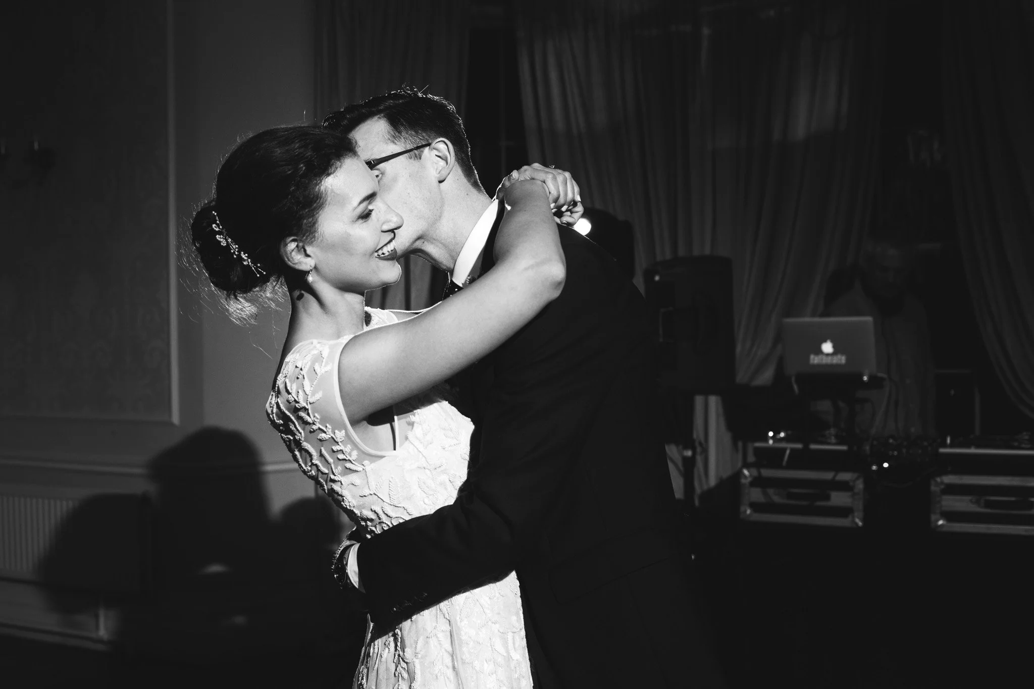 Groom wispers into brides ear during their first dance at their Eastington Park wedding.